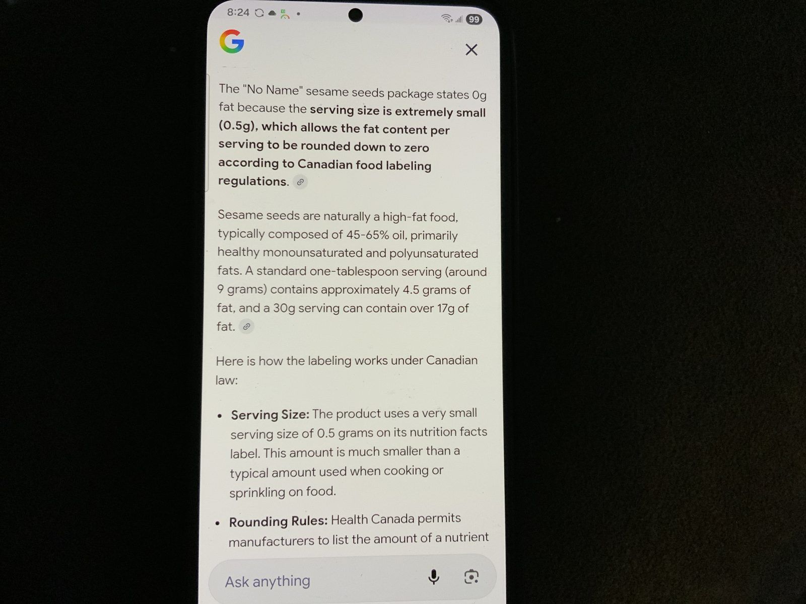Sesame seeds confused Home › Forums › 60 Day Build & Burn Challenge 2026 › Sesame seeds confused Viewing 6 posts - 1 through 6 (of 6 total) Author Posts January 6, 2026 at 2:16 pm #605479 shelly.milovichParticipant I bought a package of sesame seeds and on the back of the package it says 0 fat Why is sesame seeds in the fat category? January 6, 2026 at 2:43 pm #605487 MaureenModerator shelly.milovich wrote: I bought a package of sesame seeds and on the back of the package it says 0 fat Why is sesame seeds in the fat category? it looks like 1 tbsp roughly has 5 grams of fat. Can you upload the nutrition label and I can take a peek January 6, 2026 at 8:08 pm #605507 shelly.milovichParticipant Here Maureen image-4 January 7, 2026 at 3:22 am #605514 NaomiModerator shelly.milovich wrote: Here Maureen This label is incorrect, A typical serving of sesame seeds (about 1 tablespoon or 11g) contains approximately 4 to 6 grams of fat. All nuts and seeds are fat sources. January 7, 2026 at 5:19 am #605524 shelly.milovichParticipant Ok Thank you Naomi. I did still use it for what it called for 😉 January 7, 2026 at 5:26 am #605527 shelly.milovichParticipant I live in Canada I googled it image-5 Author Posts Viewing 6 posts - 1 through 6 (of 6 total) You must be logged in to reply to this topic. Log In Username: Password: Keep me signed in Log In