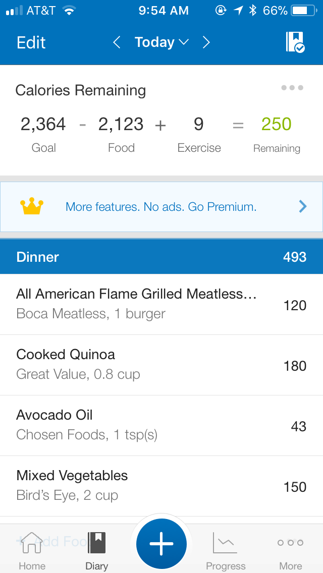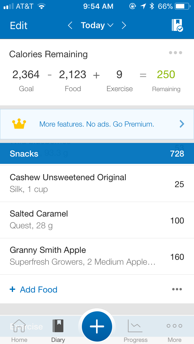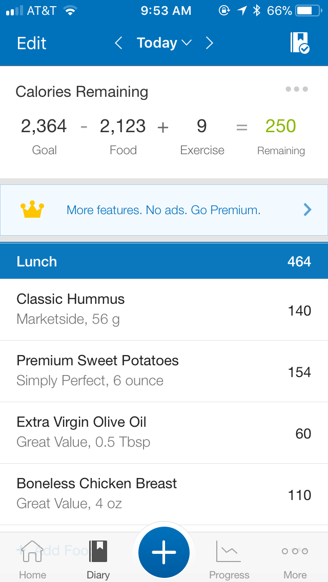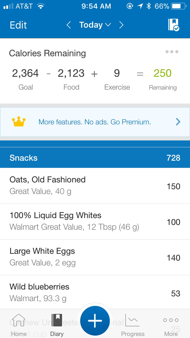 Hopefully this is what you were looking for screenshot wise, unless you meant each individual food or the total macros, etc. They are by group: Breakfast (my meal 2), Lunch, Dinner, and snacks (My pre and post workout meals since I go to the gym at 3:30-4:00 am). Please let me know if you need something different! I did notice rice cake wise that my carbs will be larger since I bought the caramel ones,next week I will switch to the lightly salted ones (yuck!) since they are 7 carbs instead of 11 per rice cake. Also, I think my green apple was too large, as it measured out at 9.14 ounces and I noticed there were posts on what size to get. In MFP it kept giving me 5.5 ounces for a medium so I doubled it. Will look for smaller apples next week.